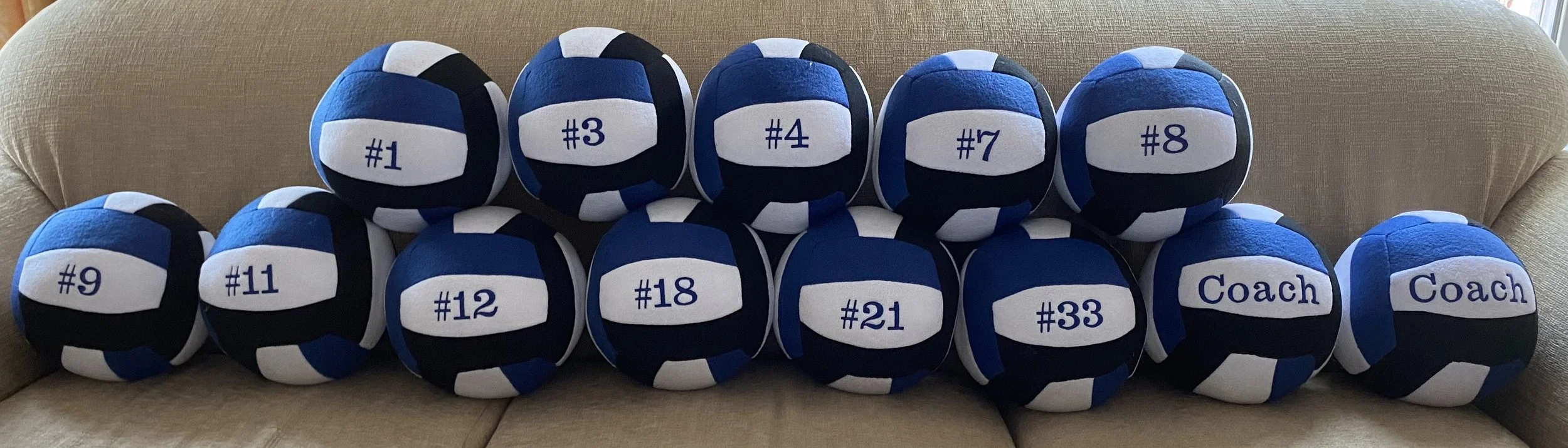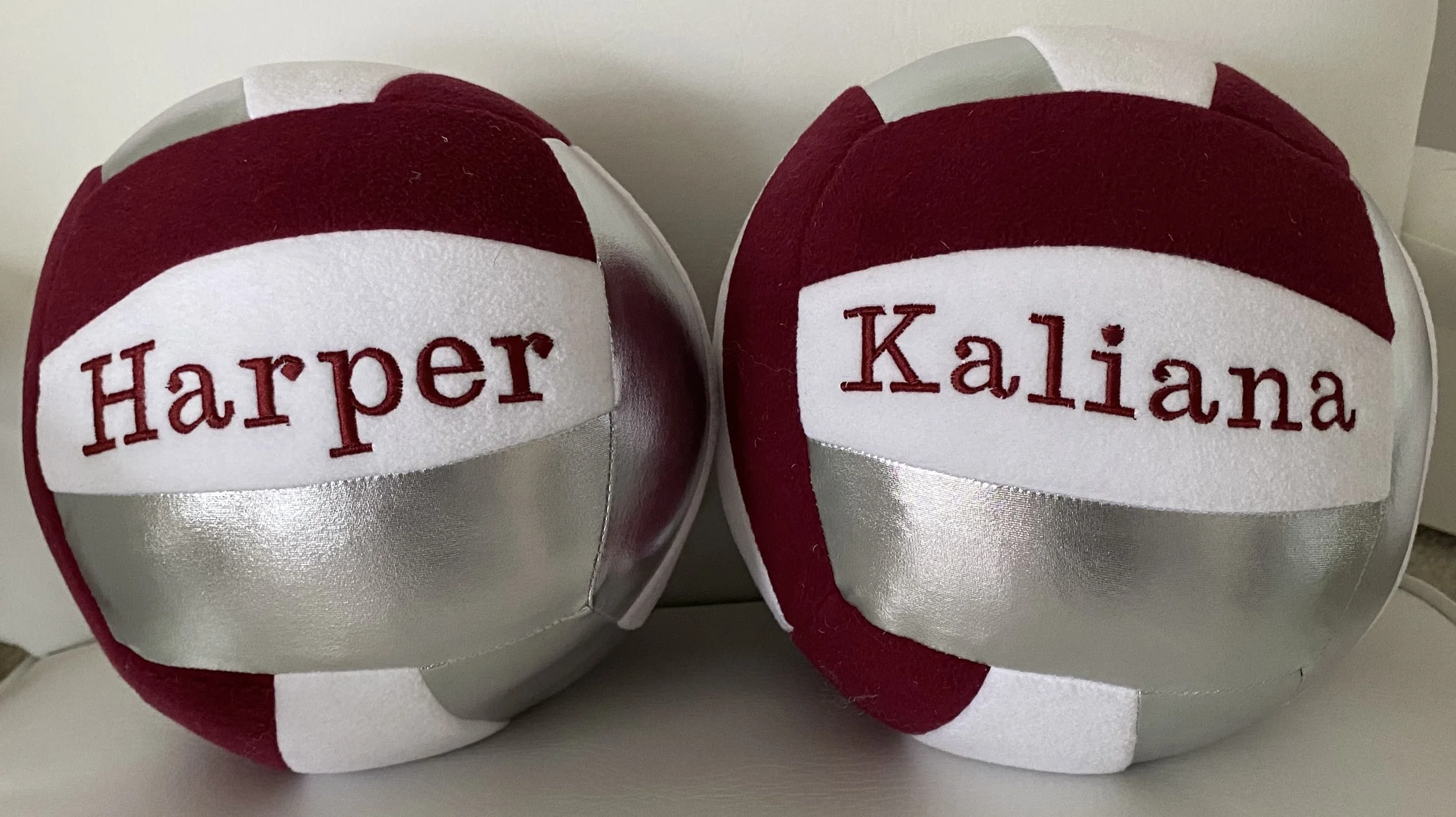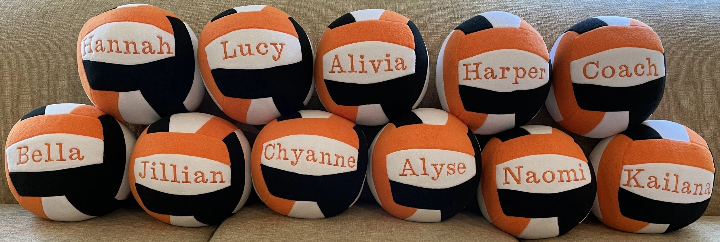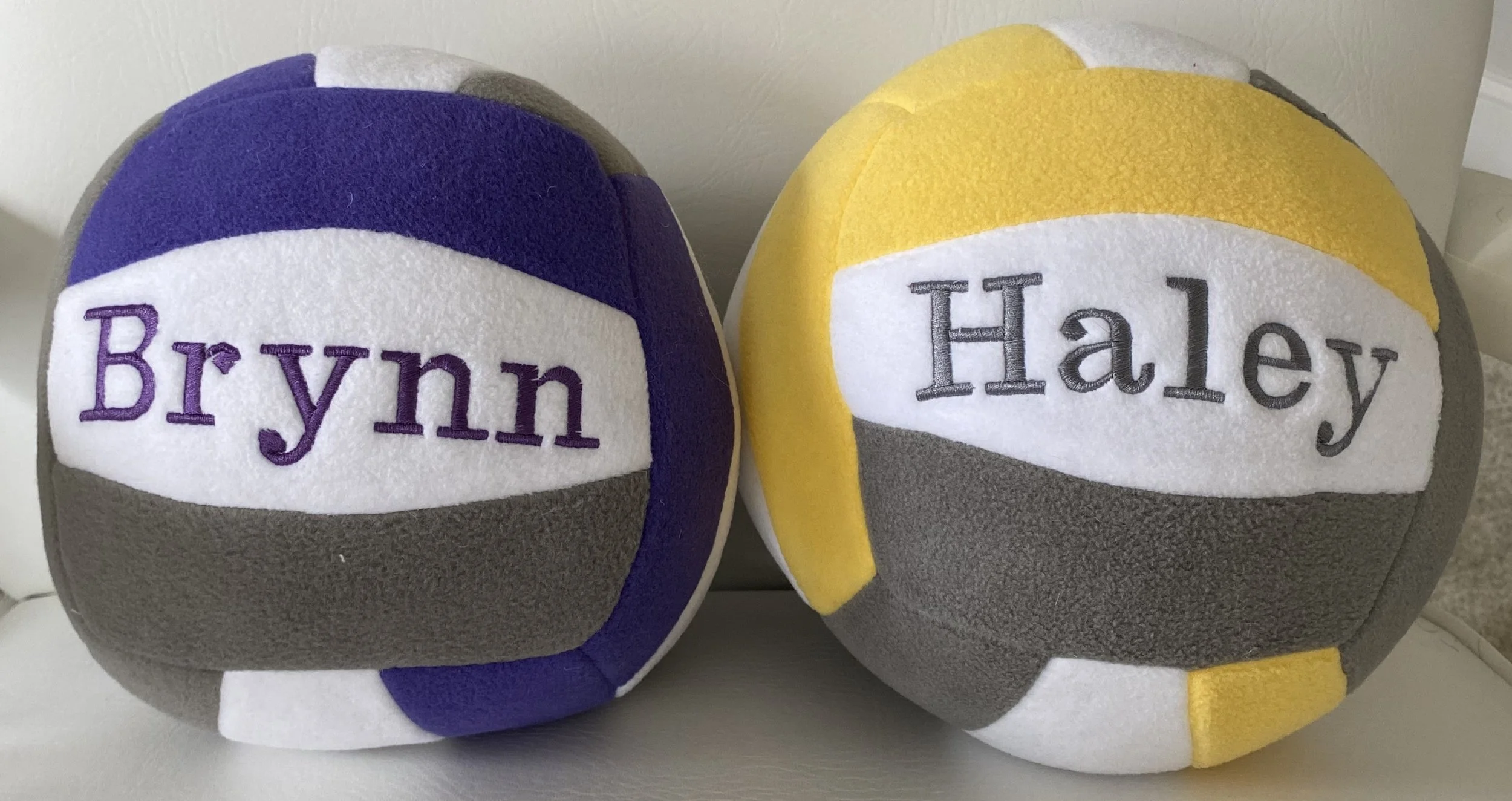 Customized volleyball pillows, crafted by hand, available in various colors, with personalized embroidery options for player’s name, number and team names.