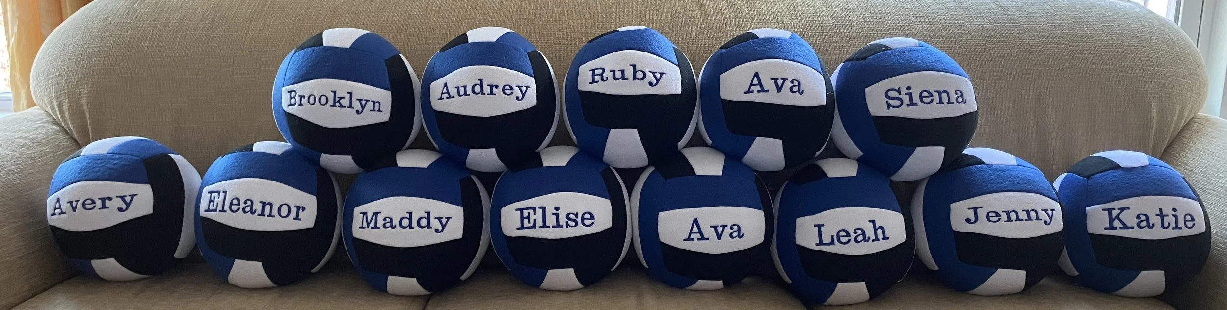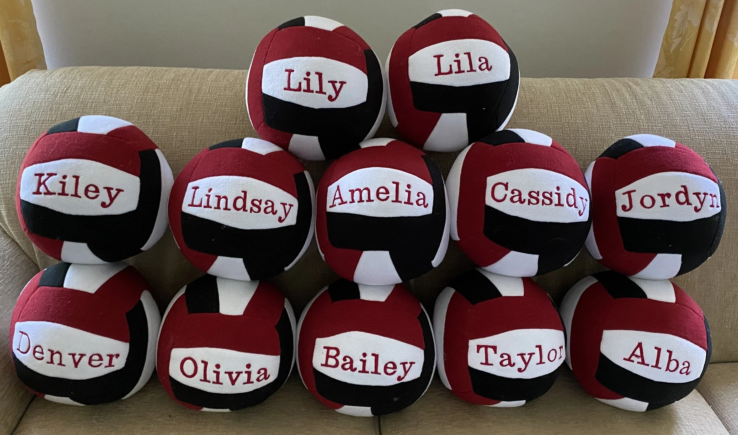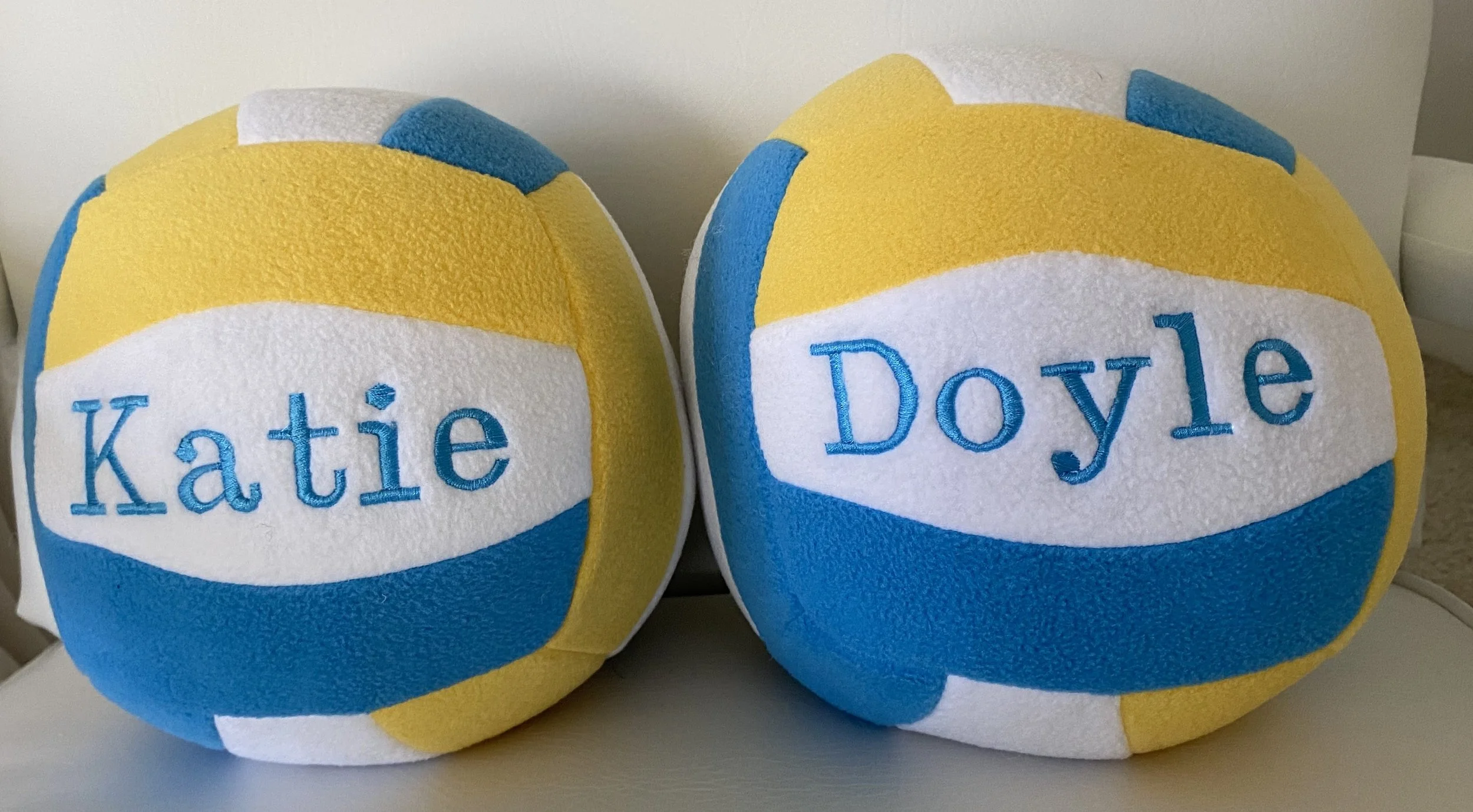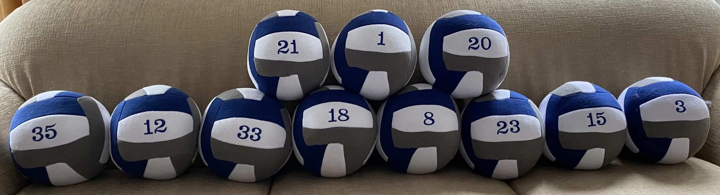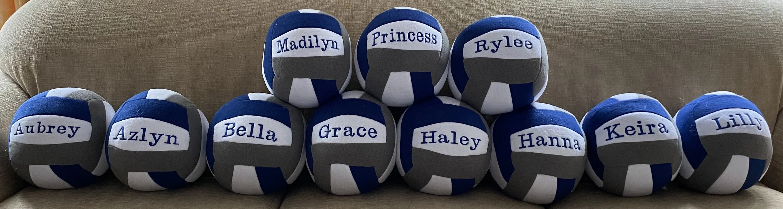 Customized volleyball pillows, crafted by hand, available in various colors, with personalized embroidery options for player’s name, number and team names.