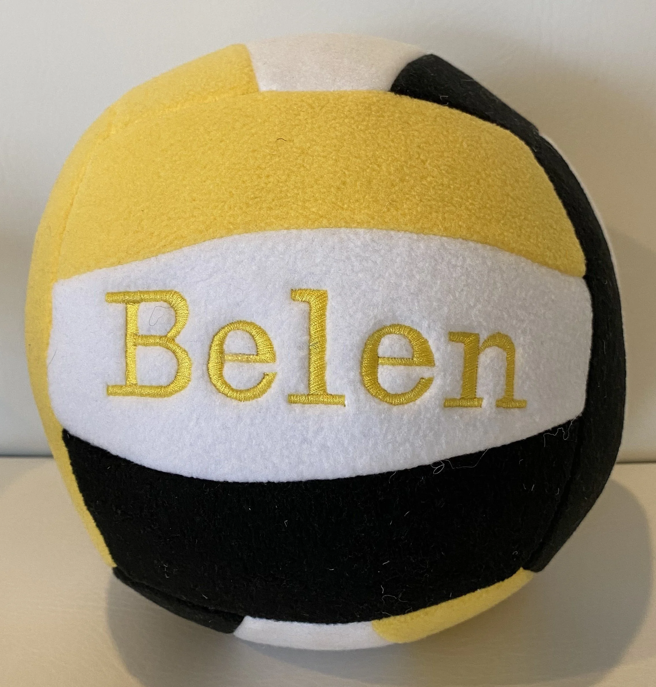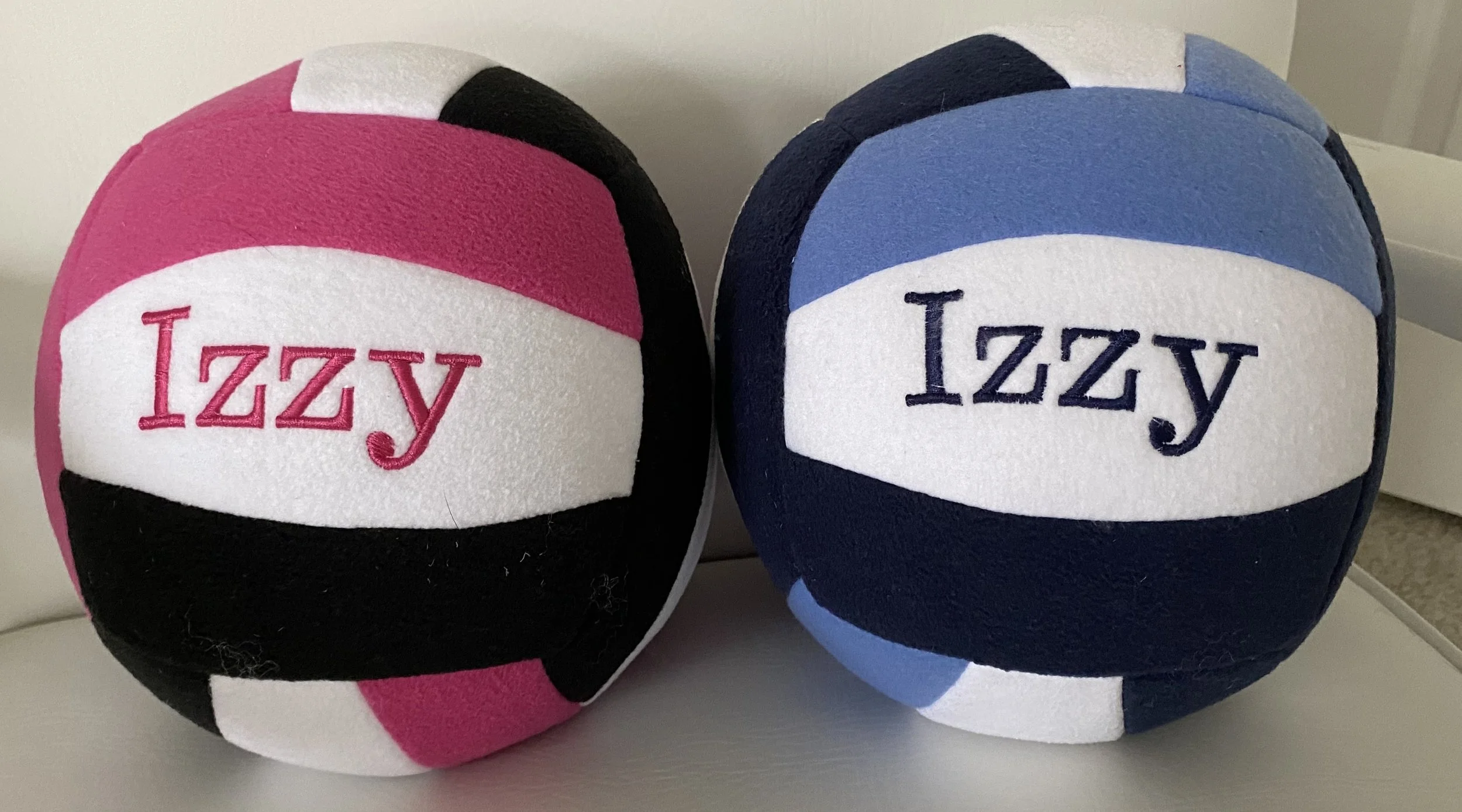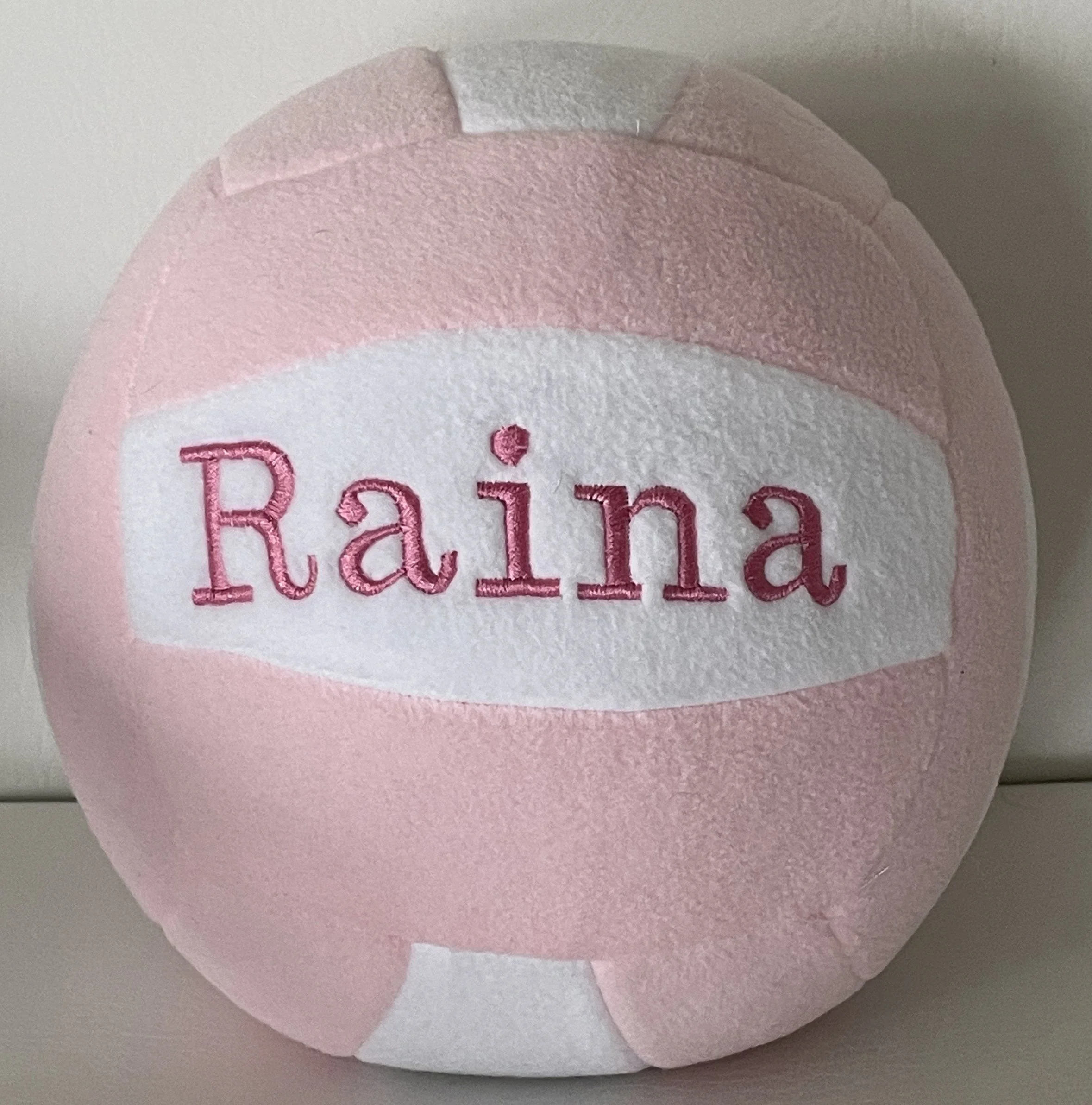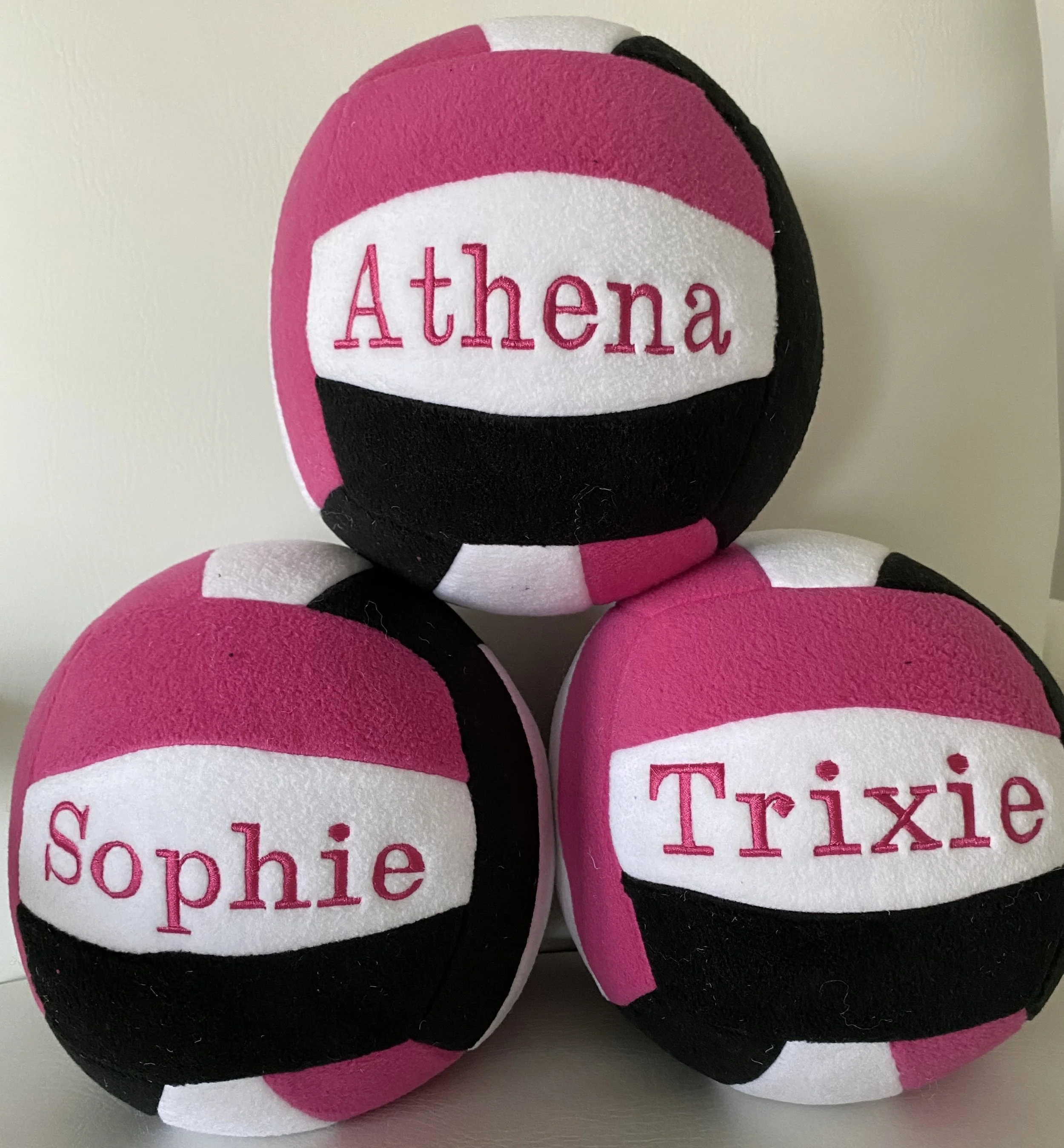 Customized volleyball pillows, crafted by hand, available in various colors, with personalized embroidery options for player’s name, number and team names.